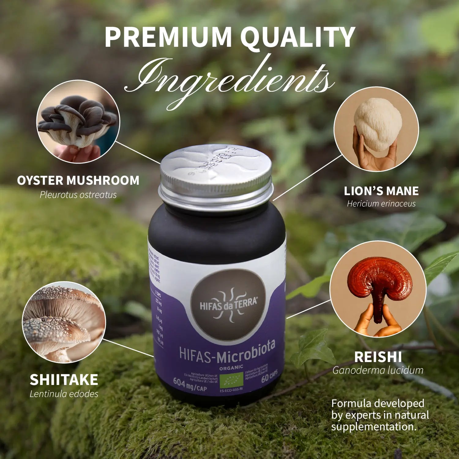 Hifas Microbiota apporte à votre corps une variété de substances bioactives provenant de champignons purs tels que le Reishi, la Crinière de Lion, le Pleurotus et le Shiitake. Ces espèces très connues et utilisées dans la culture orientale sont riches en fibres. Il s'agit des beta-glucanes, auxquels on attribue un effet prébiotique. Plus précisément, elles contiennent des substances bioactives telles que les β-(1-3), (1-6) D-glucanes, les α-glucanes, les triterpénoïdes, l’acide ganodérique, l’acide linolénique, l’hericenone et l’ergostérol (précurseur de la vitamine D2). Hifas da Terra a mené une étude avec les extraits présents dans Hifas Microbiota afin d’évaluer son impact chez les patients atteints de SIBO.