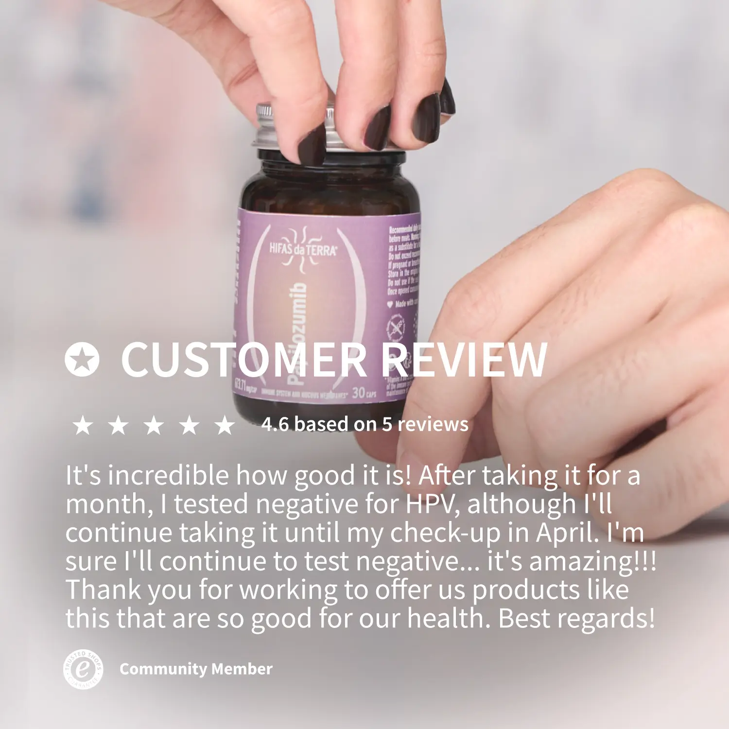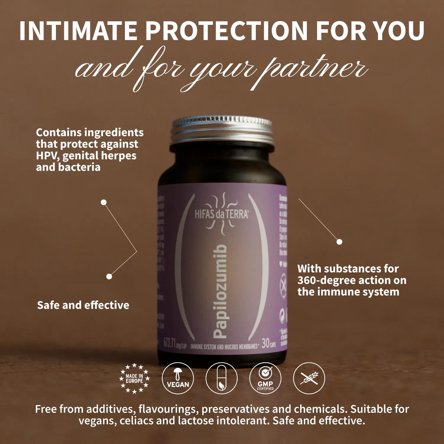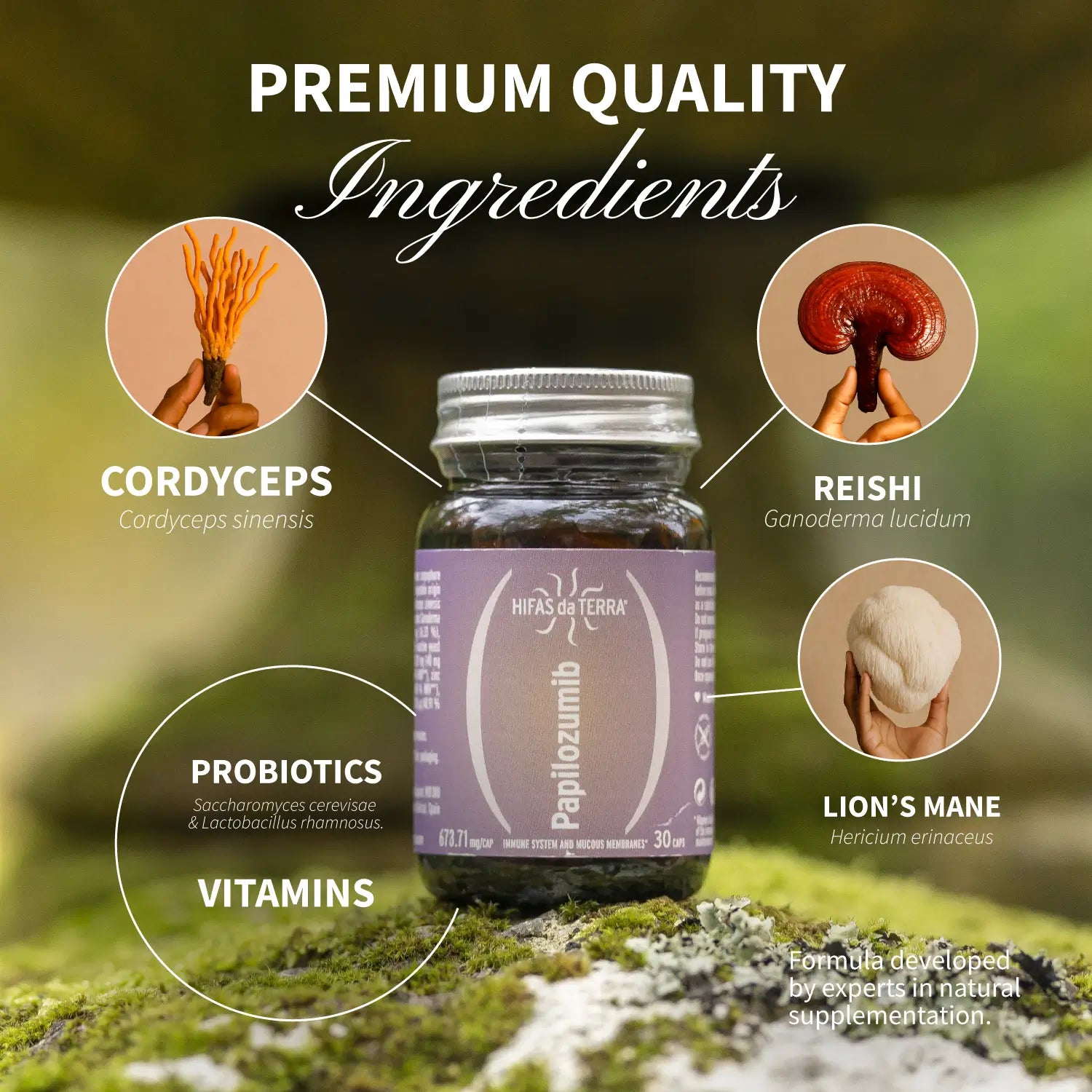 Le Papilozumib est un complément alimentaire formulé principalement à base de Reishi, de Cordyceps, de Crinière de Lion, de minéraux (zinc et sélénium), de vitamines (A, C, D3 et E) et des probiotiques de Lactobacillus qui contribuent au fonctionnement normal du système immunitaire et du maintien des muqueuses.