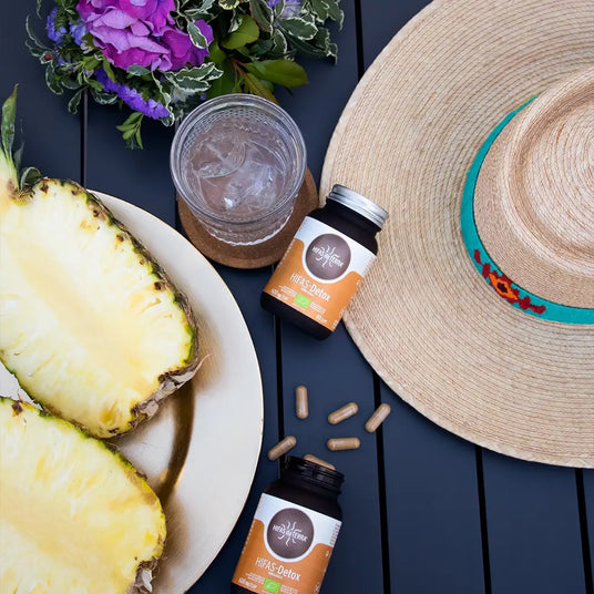 HIFAS-DETOX contient des composés bioactifs extraits de deux souches, sélectionnées par Hifas da Terra, des champignons Maitake et Polyporus. Ces composés incluent des β-(1-3),(1-6) D-glucanes et α-glucanes, des triterpénoïdes, de l’ergothionéine et de l’ergostérol, un précurseur de la vitamine D2. La formule est enrichie en vitamine C naturelle issue de l’acerola (Malpighia glabra). La vitamine C contribue au métabolisme énergétique, au fonctionnement normal du système immunitaire* et à la protection des cellules contre le stress oxydatif*. Elle aide également à réduire la fatigue et l’épuisement. Hifas da Terra a mené une étude clinique sur les extraits de HIFAS-DETOX afin d’évaluer leur capacité détoxifiante (chélatante des métaux lourds), en s’appuyant sur la littérature scientifique existante.