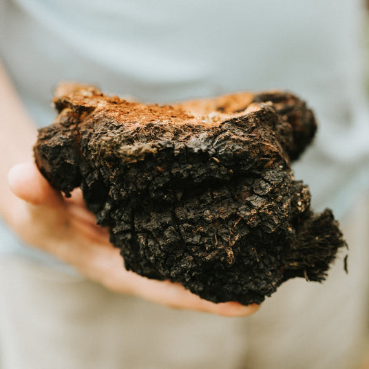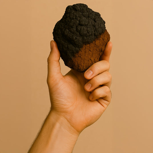Chaga lebt in Symbiose mit geschwächten Birken und wächst dort über viele Jahre. Erst nach 20 – 30 Jahren bildet dieser Pilz einen kohlschwarzen Sklerotienklumpen von der Größe eines Kinderkopfes. Diese harte Masse ähnelt keinem typischen Fruchtkörper; das eigentliche Sklerotium sitzt im Inneren des befallenen Stammes. Sowohl die raue Kruste als auch das Innere zeigen ein charakteristisches Dunkelbraun – verursacht durch eine hohe Melaninproduktion, dasselbe Pigment, das unsere Haut beim Sonnenbaden bräunt.