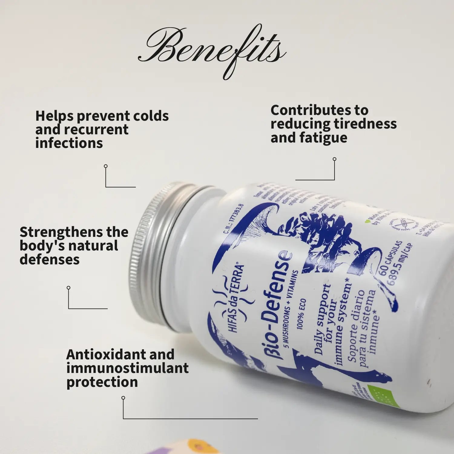 Mit Bio-Defense steht Ihnen ein natürliches Nahrungsergänzungsmittel in 100 % Bio-Qualität zur Verfügung, das wertvolle Inhaltsstoffe enthält, die nachweislich Ihr Immunsystem stärken.* Die Formel von Bio-Defense vereint fünf Vitalpilze – Reishi (Ganoderma lucidum), Maitake (Grifola frondosa), Shiitake (Lentinula edodes), Austernseitling (Pleurotus ostreatus) und brauner Kräuter-Seitling (Pleurotus eryngii). Diese Pilze zeichnen sich durch einen besonders hohen Gehalt an Beta-Glucanen aus.